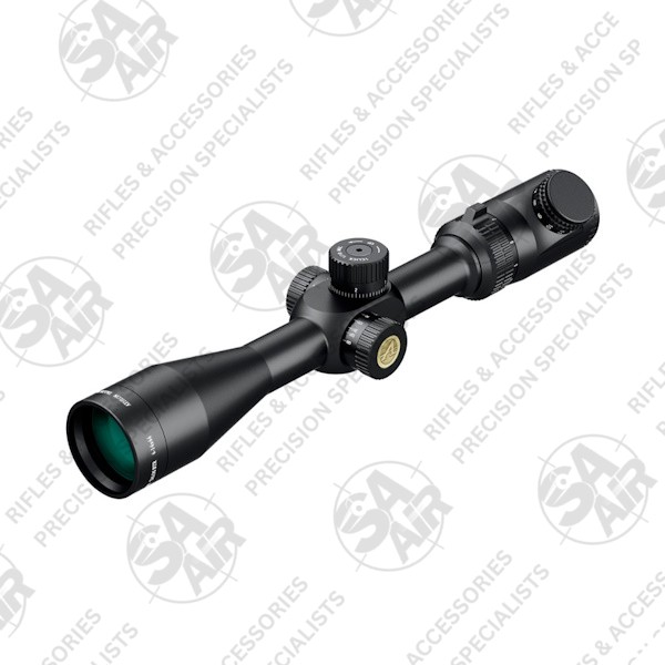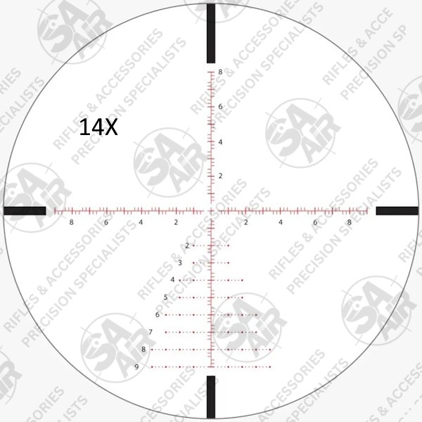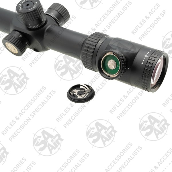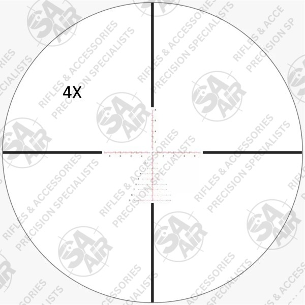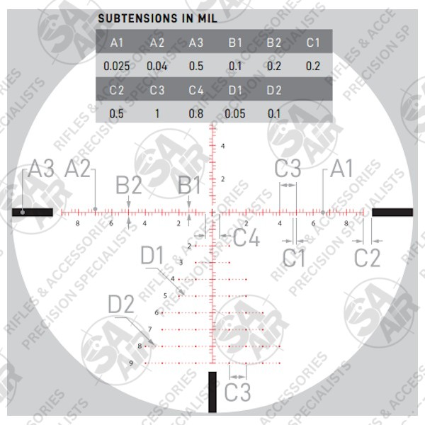 This scope only comes in the MIL (MRAD) version with the APLR2 illuminated reticle, set at FFP, so the detailed subtensions will always stay matched in all magnifications. The adjustment graduation is 0.1 MIL per click, with the maximum adjustment for elevation and windage of 18 MIL for both.
