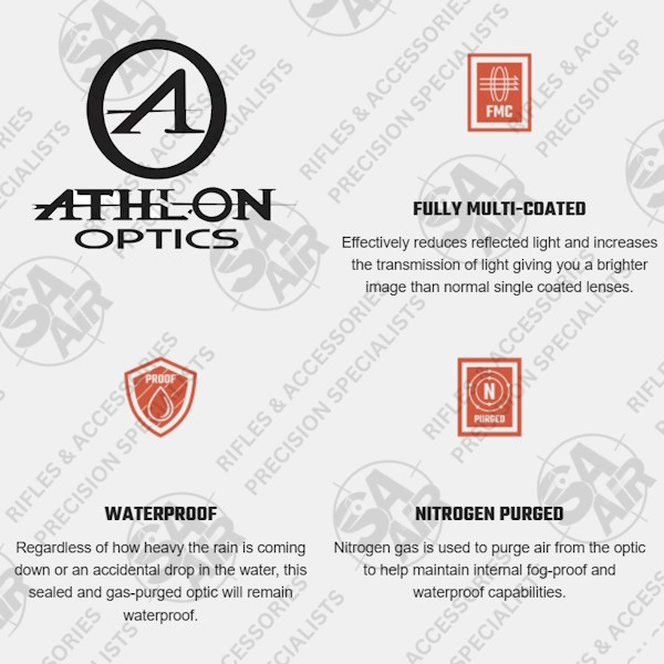 Fully Multi-Coated: Shoot in most conditions. Athlon Optic’s fully multi-coated glass gives you better light transmission. With optimum brightness, as well as true colour across the entire light spectrum.