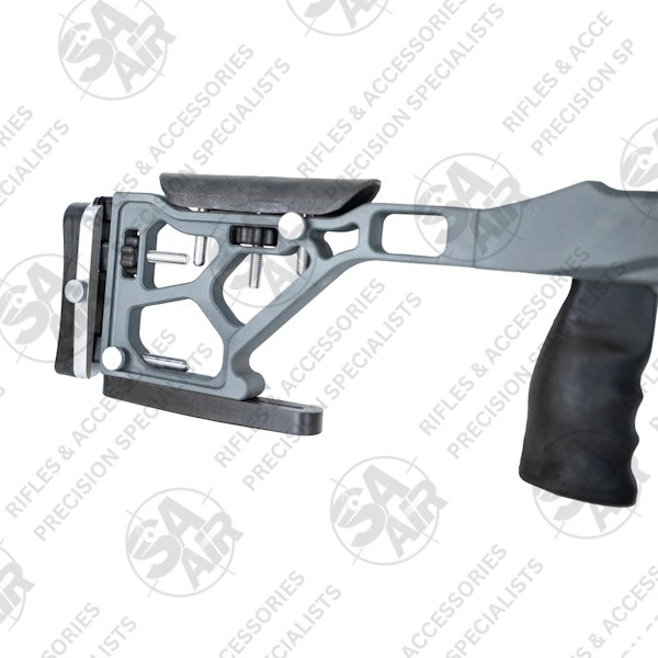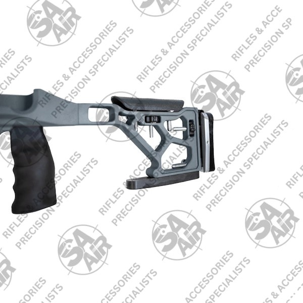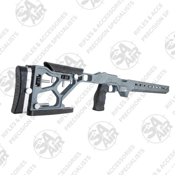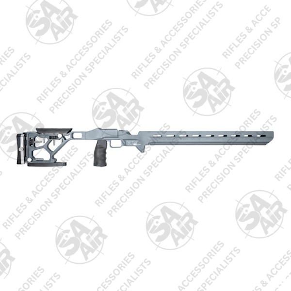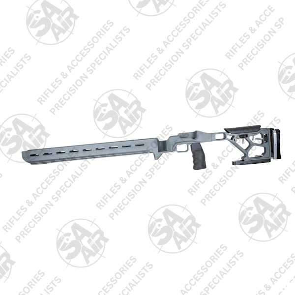 This precision chassis features a matt grey finish with 99cm length and incorporates an adjustable cheek rest and extendable buttstock for customised length of pull. The wide footprint design includes a rear bag rider for enhanced stability. Meanwhile, the vertical pistol grip system accepts standard AR-pattern grips. So, you can swop out the included grip if you want to.
