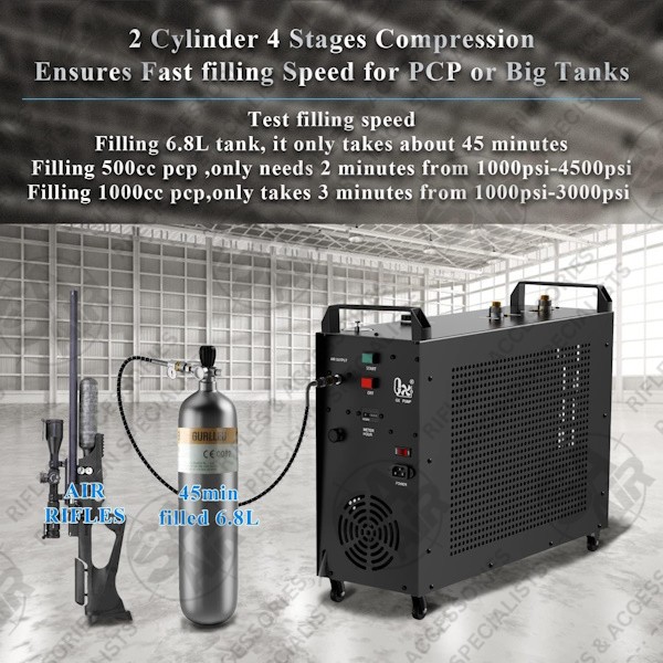 Performance: Capable of filling 6.8L tanks from 0-4500 PSI in about 45 minutes and handles up to 20L tanks.
