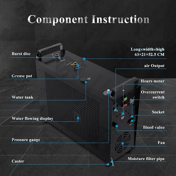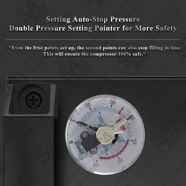 Power & Capacity: It features a 1200W motor, capable of reaching pressures up to 5800psi, and is designed to handle large PCP/Paintball/Scuba tanks up to 20L.