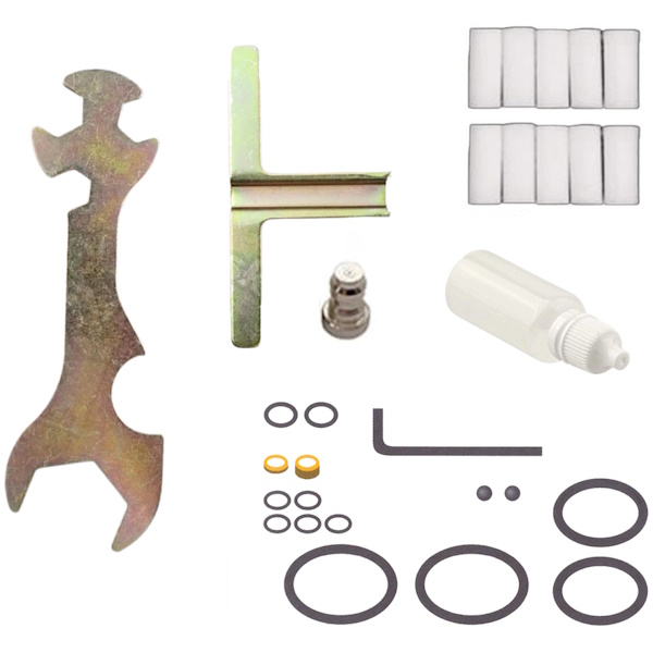 Assembly is quick and easy, with the included Allen key fitting all 4 necessary screws. GX included tools for assembly and maintenance, spare seals and parts, as well as some silicon oil and a test plug to maintain your hand pump.